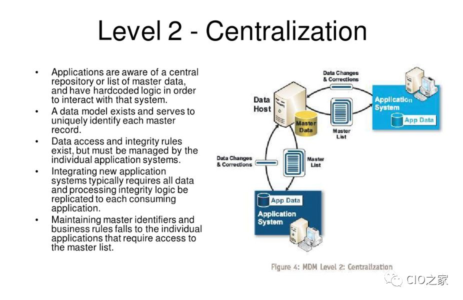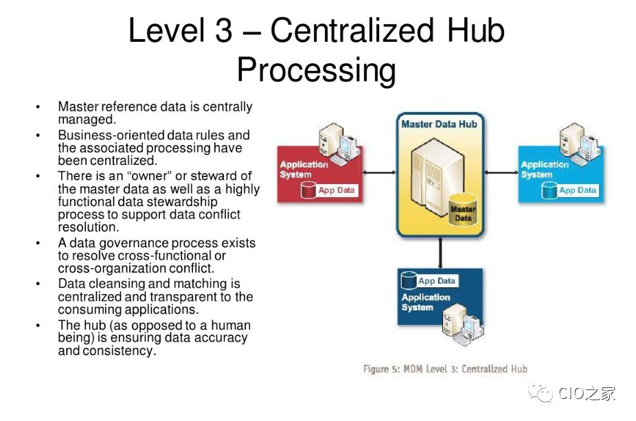 与Level 2相比,Level 3打破了各个独立应用的组织边界,使用各个系统都能接受的数据标准统一建立和维护主数据(Level 2的主数据主机上存储的数据还是按照各个系统分开存储的,没有真正的整合在一起)。集中处理意味着为MDM构建了一个通用的、基于目标构建的平台。