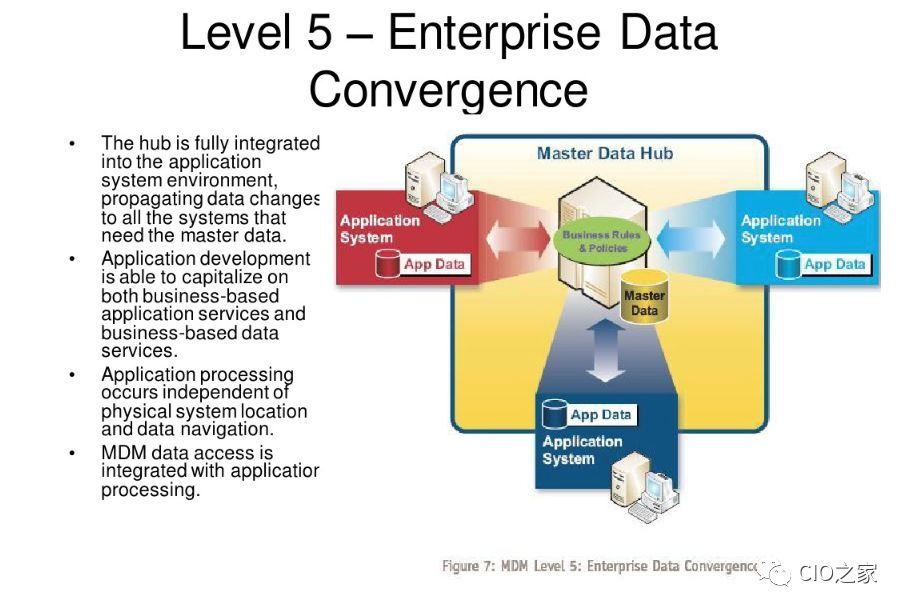 一个公司在完成MDM Level 5后将使他们所有的应用连在一起—既包括操作的也包括分析的—所有访问主数据是透明的。Level 5是把数据概念作为一种service来实现。Level 5保证了一个一致的主数据主题域企业映像。定义“客户”和其他应用接受客户主数据业务规则变化实际上是一回事。Level 5移走了主数据的最后一个障碍:统一采用数据定义、授权使用和变更传播。
