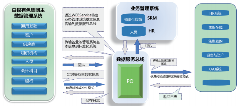 集成方案有二种,其中一种是通过数据服务总线系统(PO)方式分发或订阅主数据,另外一种是通过主数据系统和目标系统后台表对表方式传递数据。结合集团的业务特点,一般推荐使用企业数据服务总线(PO)的方式进行系统集成。