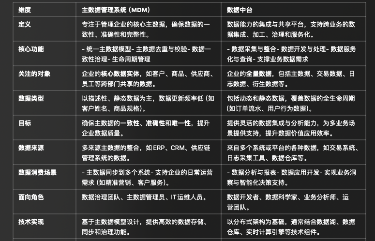 主数据管理系统(MDM,Master Data Management)的核心职责是管理企业的核心业务对象(如客户、商品、供应商等)的基础数据,确保数据的统一性、准确性和完整性。