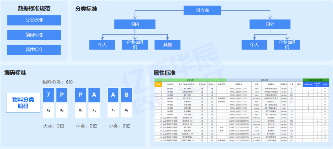 在具体操作中,以数据标准规范为例,将其分为分类标准、编码标准和属性标准三类。分类标准用于对主数据进行合理的划分,如供应商可分为国内供应商和国外供应商等。编码标准则用于统一各业务系统中对同一主数据的编码,通过建立编码映射关系,实现企业级主数据的统一管理。属性标准则定义了主数据的字段、技术标准、维护部门等关键信息,确保主数据在属性层面的准确性和完整性。