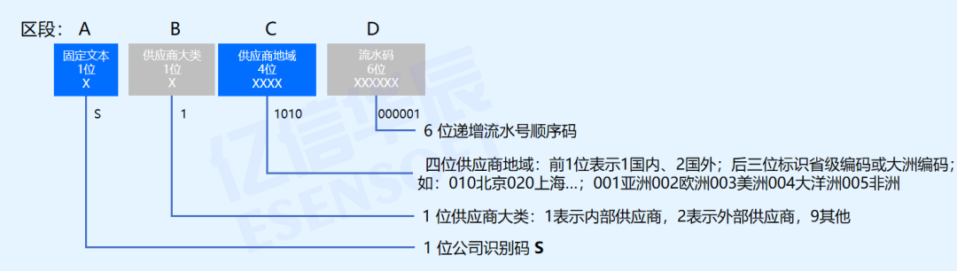 上图以供应商主数据编码为例,展示了如何根据企业实际业务制定编码方案。该方案将供应商编码分为四段,分别代表供应商识别码、大类、地域和流水码,确保编码的唯一性和可读性。同时,编码方案应结合企业实际业务进行制定,避免一刀切的做法。 数字化转型网www.szhzxw.cn