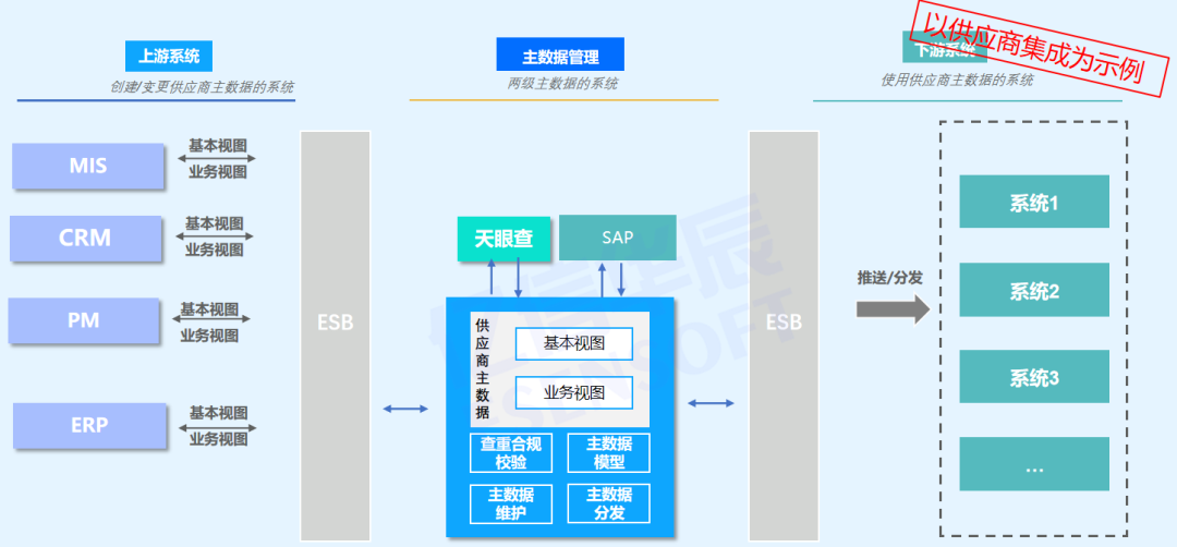 在主数据详细设计中,集成方案也是不可或缺的一部分。以供应商主数据为例,上图展示了主数据平台与各业务系统之间的集成方式,通过明确各业务系统的数据来源、校验机制、交互方式及数据分发流程,确保主数据在跨系统间的准确传递和高效利用。 数字化转型网www.szhzxw.cn