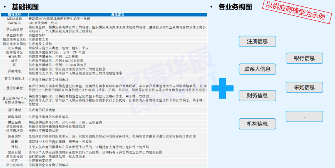 以供应商模型为例,梳理模型由哪些构成,哪些视图。基础视图是各业务系统共有的信息集合,为各系统提供统一的数据基础。而业务视图则根据具体业务需求进行定制,实现数据的个性化展示和利用。在构建这些视图时,需要对字段、属性定义等进行详细约定,确保数据的准确性和一致性。