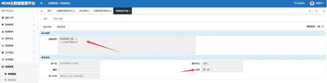 3.当进行数据导入操作时MDM平台会根据相关的校验规则对数据进行校验,如下图:校验未通过的数据会进行相应的提示。数字化转型网www.szhzxw.cn