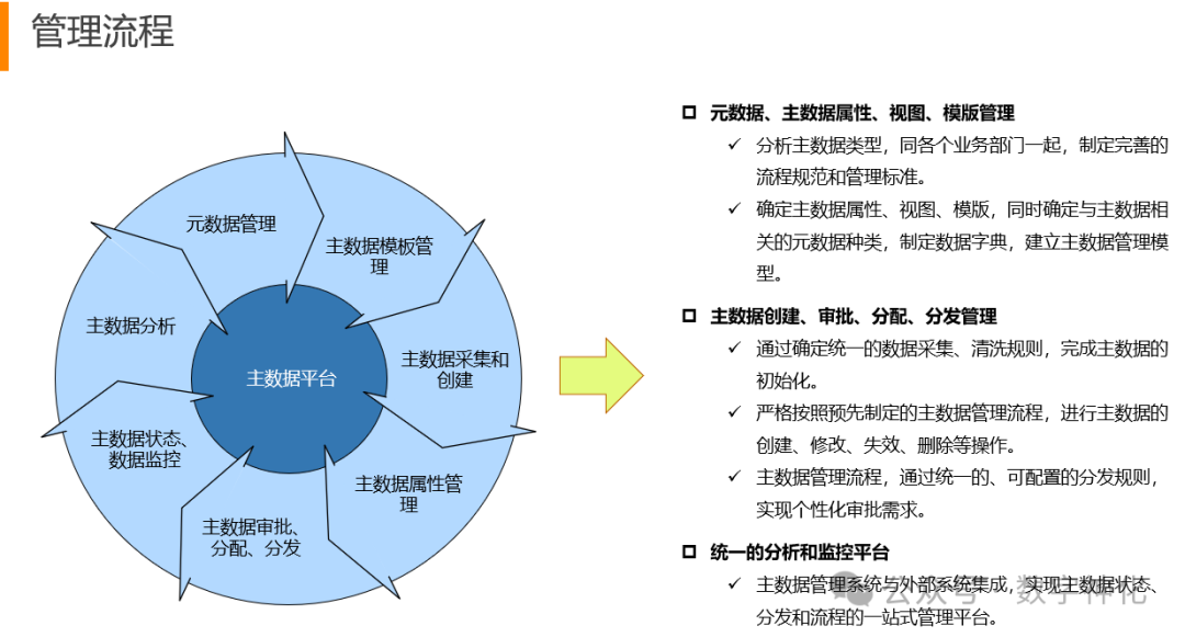 主数据模型设计:建立一个统一的主数据模型,定义组织中核心数据的结构和关系。模型应包含所有关键业务实体和属性,并确保与业务流程的整合。