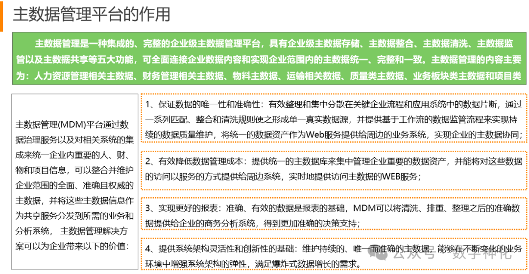 主数据是指在企业内部跨部门、跨业务、跨系统,能够被重复利用和充分共享,具有高价值且相对稳定的基础数据。在集团企业中,主数据种类有很多,包括但不限于人力资源管理相关数据、财务管理相关数据、物料主数据、供应商数据、客户数据等。需要明确哪些数据属于主数据,并对其进行分类管理。