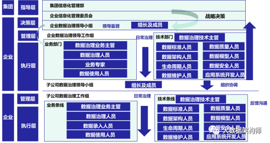 企业要建立主数据管理组织,确定主数据工作的相关各方的责任和关系,包括确定主数据过程中的决策、管理、执行等活动的参与方和负责方,以及各方承担的角色和职责等,如下图所示: