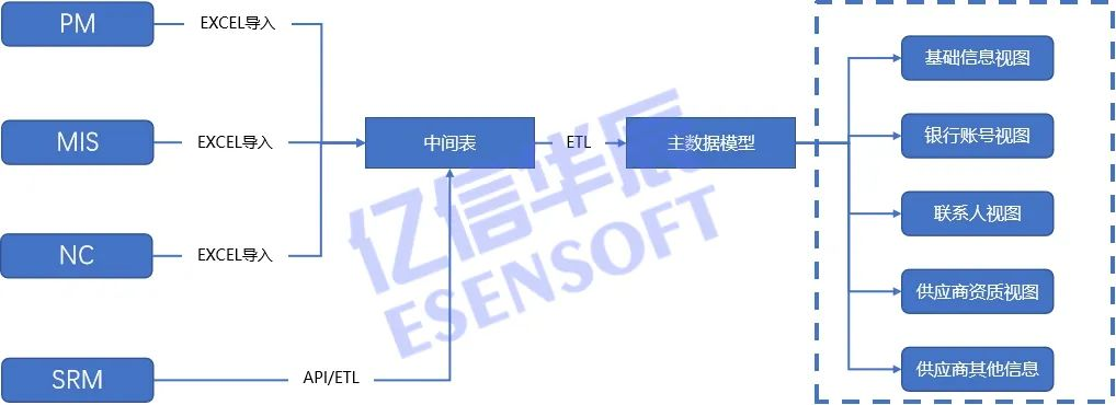 供应商主数据接入包括历史数据和SRM新增数据两部分,接入数据统一纳入中间表,待进行数据清洗后,写入主数据模型五个视图中。