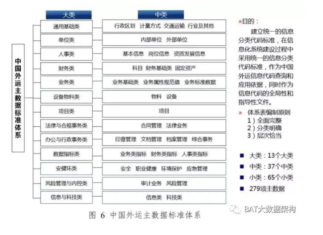 3.主数据代码体系表:在某些领域内,又称主数据资产目录。是描述企事业单位信息化建设过程中所使用的主数据代码种类、各类主数据代码名称、代码属性(分类、明细、规则等)、采(参)标号及代码建设情况的汇总表,是企业主数据代码查询和应用的依据,同时也是主数据代码的全局性和指导性文件。主数据代码体系表主要结合了企业的经营管理特点,服务于企业信息化建设,主要包括两部分内容,第一是企业信息代码体系表的框架结构以及分类,第二是所有分类下的信息代码标准明细以及建设情况。如政府数据应用领域的政务信息资源目录体系。