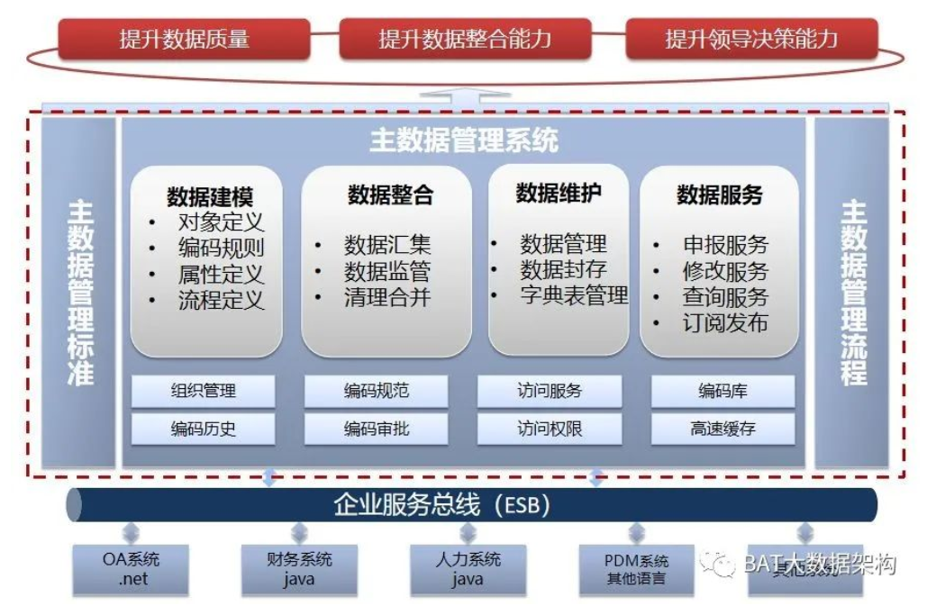 4.主数据存储和服务:主数据平台发布的基准数据,集中存储于主数据基准库,提供在线查询和订阅功能,并通过流程驱动和消息驱动的标准接口提供数据共享服务。