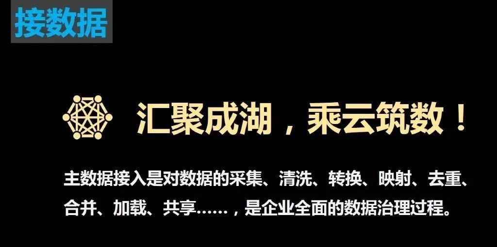 主数据接入是将主数据从数据源系统汇集到主数据平台的过程。该过程需要对接入的数据进行清洗、转换、映射、去重、合并、加载……,通过一系列的数据加工和处理形成标准统一的主数据。