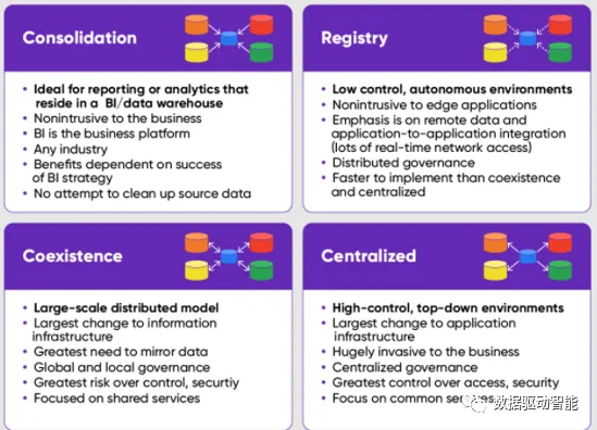•分析型MDM:主要重点是提供关于主数据必须如何由商业智能(BI)技术和数据仓库处理的最佳分析和报告。它们对业务也有很多价值,但对系统的操作部分没有影响。