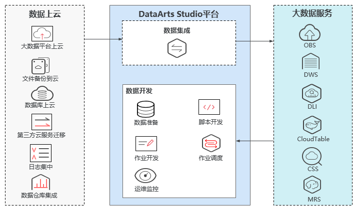 快速将线下数据迁移上云,将数据集成到云上大数据服务中,并在DataArts Studio的界面中就可以进行快速的数据开发工作,让企业数据体系的建设变得如此简单。