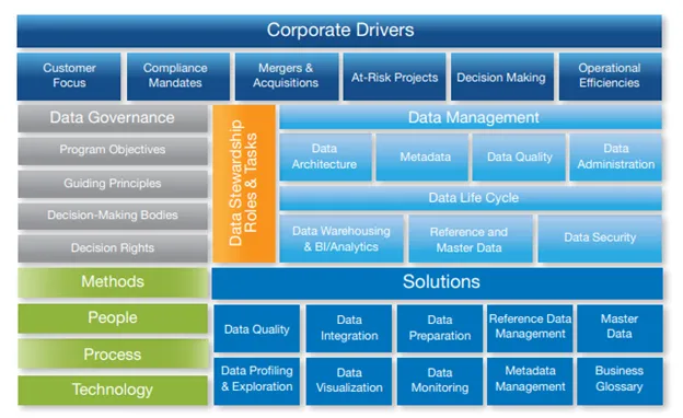 该框架由EckersonGroup开发,强调在现实场景中实际实施数据治理。它解决了数据质量、治理结构和利益相关者认同的需求。Eckerson的框架对于寻求实施数据治理并确保IT和业务利益相关者之间保持一致的组织特别有效。