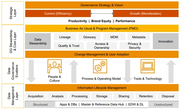 德勤数据治理框架侧重于运营效率和法规遵从性。该框架提供了管理数据收集、存储和使用的详细结构,重点强调风险管理和隐私。它还支持组织创建一种治理文化,确保所有部门的一致性和问责制。