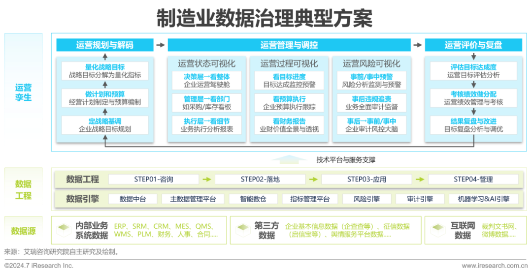制造业企业的数字系统建设水平相对较高,具备ERP、MES、PLM、OA等运营管理系统管理系统,但这些系统彼此孤立,系统间数据标准不一致、数据质量不高、资产建设薄弱且数据共享能力不足。制造业的数据治理核心是“业务驱动”这一理念,围绕这一理念展开数据治理这一工作,从线上化咨询到落地、到场景化应用以及项目建设前期、中期、后期的运营管理进行阶段性建设。通过对企业经营管理、战略运营、绩效管理、审计风控等场景化建设,从不同维度加强企业经营管理的辅助决策、过程分析、风险管控,加速制造业数字化转型。