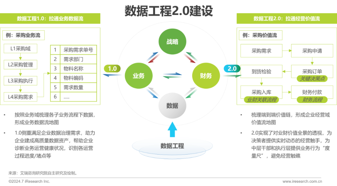 数据工程1.0核心围绕企业全业务域梳理业务数据流,形成业务数据地图,帮助企业诊断业务运营健康状况,识别并分析各运营过程的进度或堵点等。数据工程2.0从企业战略出发,以“创造价值”为内核,进一步拉通业务运营与财务数据,形成业务决策与财务核算融合的企业“运营孪生体”,前置化感知企业经营行为对财务报表的影响结果,在企业战略运营、全面预算、成本管控、现金流调度、司库管理等方面,赋能企业通过最佳资源与资金配置,引导并实现价值增值与流动,发挥业财大数据价值。