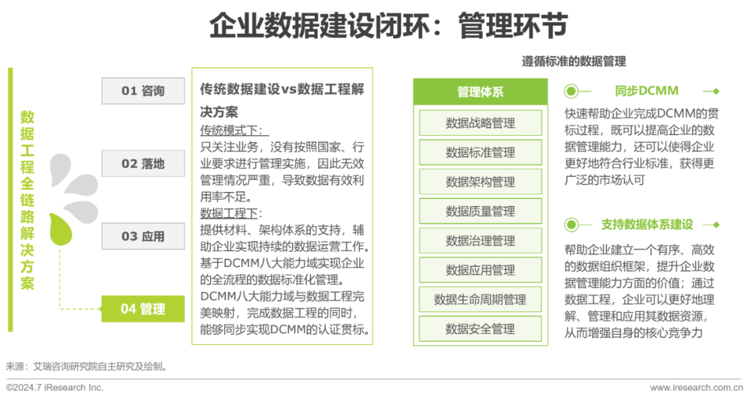 DCMM数据管理能力成熟度评估模型,是我国在数据管理领域首个正式发布的国家标准,从组织、制度、流程、技术等不同领域提供不同维度的数据整合及管理能力,提供从数据生存周期到数据应用的全过程数据管理。通过开展数据工程咨询与落地,全面覆盖DCMM要求的能力项,包括45项数据管理运营体系(形成数据文化)建设+105项技术平台落地需求,实现从数据战略、数据标准、数据架构、数据质量、数据治理、数据应用、数据全生命周期、数据安全等层面的数据管理。同时,为保障企业数据体系的顺利运营,通过数据工程,提供材料、架构体系的支持,实现持续的数据运营工作,确保数据工程能够有效落地。