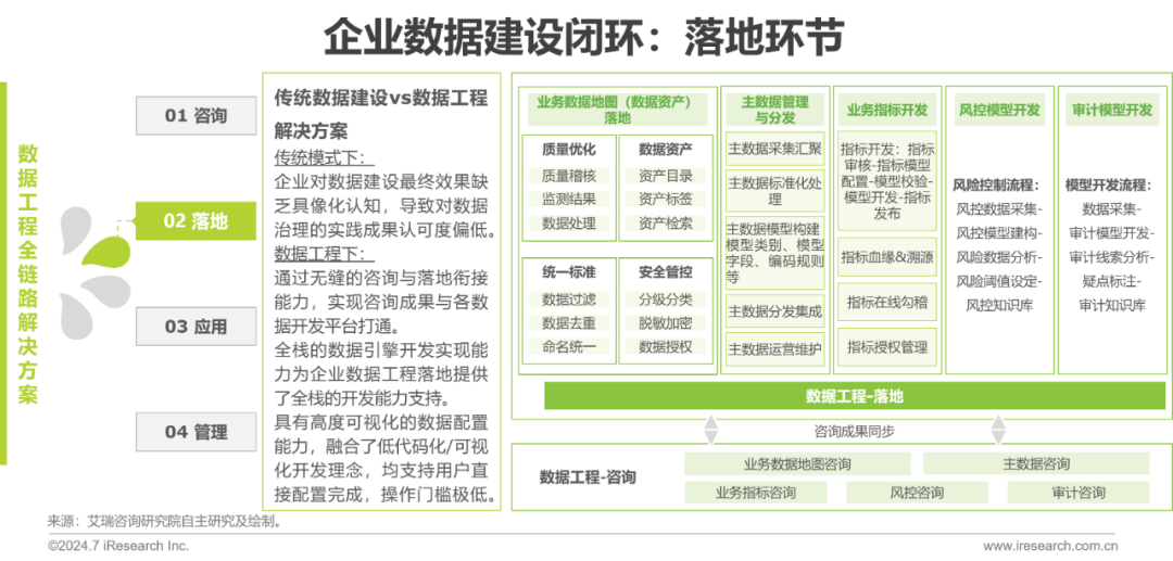 落地环节中,能够实现落地的内容包括数据资产落地、主数据管理与分发、业务指标开发、风控模型开发以及审计模型的开发等。基于咨询阶段 “业务数据地图”的梳理成果,能够快速落地各业务域下的业务数据地图模型,支持企业快速开展数据集成汇聚、数据标准执行、数据质量优化、数据安全管控、数据血缘分析、数据资产管理及服务。基于主数据的调研咨询成果,能够实现主数据快速接入与处理,以及一键同步咨询阶段梳理的主数据模型并建立映射、构建灵活的分发规则以及对主数据的全生命周期管理。基于业务指标咨询成果,形成业务指标地图、梳理定义业务指标属性、构建指标责任矩阵,为指标应用奠定基础。基于审计风控咨询,沉淀审计风控知识,构建审计风控资源,沉淀审计风控模型,形成审计风控知识库,为企业风控审计提供模型及知识基础,赋能审计风控应用。数字化转型网www.szhzxw.cn