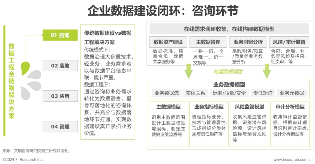 企业数据建设是一项系统工程,需要解析业务现象背后的需求原因,针对性地实现落地,才能帮助企业善用数据资产,充分释放数据价值,进一步为实践提供指导。数据工程建设可分为咨询、落地、应用、管理四大环节,咨询环节是企业进行数据建设闭环管理的第一步,其能力和优势体现在三方面:第一,以“业务数据地图”为抓手,翻译业务需求为数据化语言,为数据建设确立目标与路径;第二,咨询过程与成果线上化,协同用户快速完成需求确认与修正,避免信息偏差;第三,咨询成果无缝衔接至数据平台落地开发,大幅缩短数据建设周期,减少成本投入。整体而言,咨询环节旨在帮助企业摸清数据现状、理顺数据在业务中的流向、找准数据与业务的关系,解决技术与业务脱节和咨询与落地“两张皮”难题,让数据应用少走弯路。数字化转型网www.szhzxw.cn