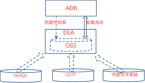 (2) 都内置了对于OSS的访问支持。OSS直接作为DLA的原生存储存在;对于ADB而言,可以通过外部表的能力,很方便的访问OSS上的结构化数据。借助外部表,数据可以自由的在DLA和ADB之间流转,做到真正的湖仓一体。