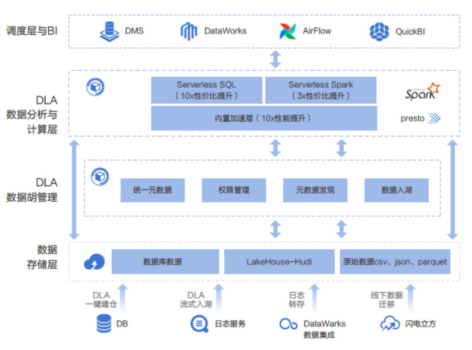 阿里云DLA数据湖解决方案[4]如上图所示,DLA 核心在于打造云原生的服务与引擎,端到端解决基于 OSS 的管理、分析、计算问题,核心关键点如下。数字化转型网www.szhzxw.cn