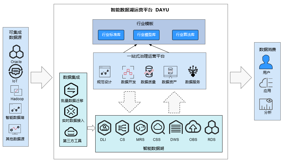 为了更好的支持数据集成、规范设计、数据开发、数据质量监控、数据资产管理、数据服务等数据湖高级功能,华为云提供了DAYU智能数据湖运营平台[10],DAYU涵盖了整个数据湖治理的核心流程,并对其提供了相应的工具支持,如下图所示。
