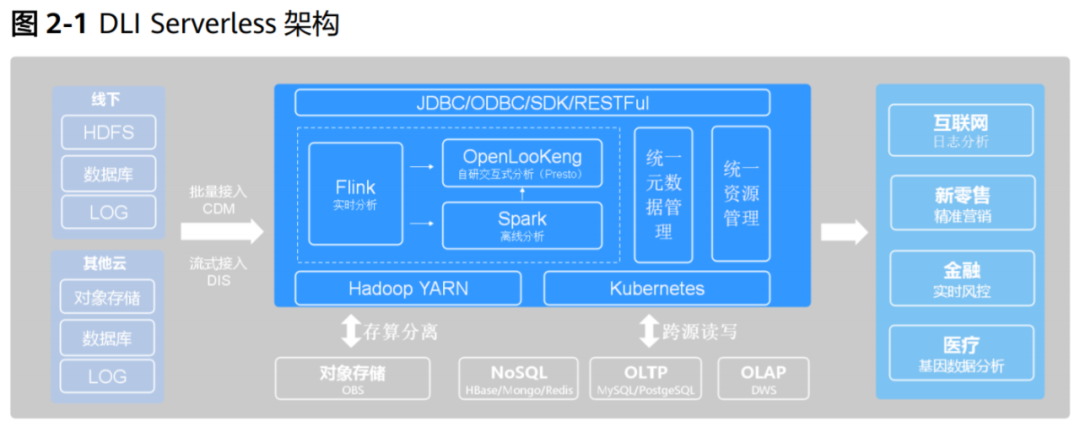 华为数据湖基于DLI Serverless[9]构建,DLI完全兼容Apache Spark、Apache Flink生态和接口,是集实时分析、离线分析、交 互式分析为一体的Serverless大数据计算分析服务。可以看到,DLI相当于是AWS的Lake Formation、GLUE、EMR(Flink&Spark)、Athena等的集合,承担了所有的数据湖构建、数据处理、数据管理、数据应用的核心功能。数字化转型网www.szhzxw.cn