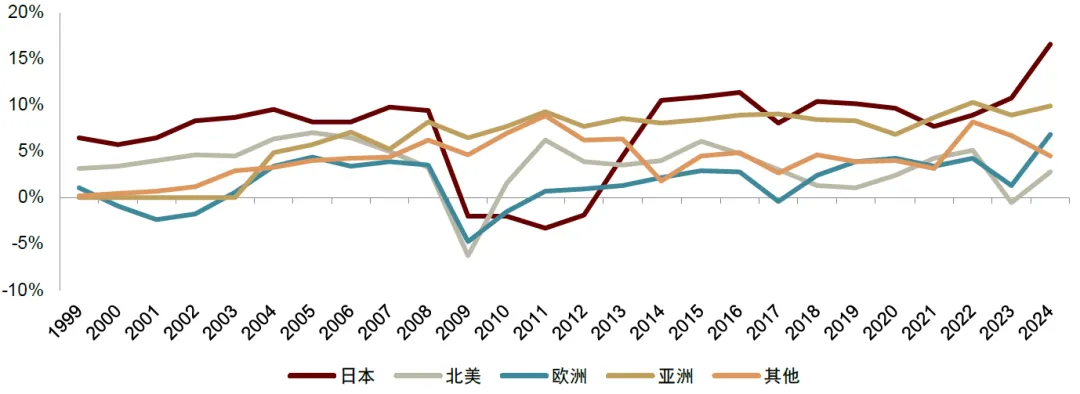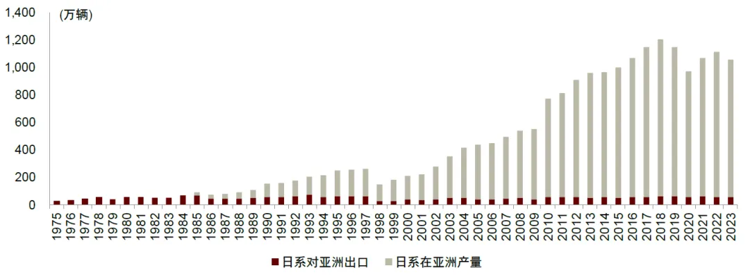 回顾日系车企进入亚洲市场(不含日本)的历程,产品出口规模稳定,长期保持在100万辆以内;海外属地化生产规模逐步扩大,尤其在2000年之后,海外产量进入上升通道,近年来基本在1000万辆以上。接下来,我们重点梳理日系车企如何布局东南亚市场,大致经历三个阶段,区域重要性逐步提升。