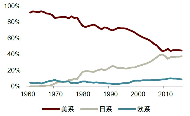 回顾日系车企进入欧洲市场的历程,初期同样以产品出口为主,1990年出口规模达到顶点(175万辆);20世纪80-90年代,部分日系车企在欧洲投资建厂,产量最高接近200万辆。日系车企拓展欧洲市场面临较多阻碍,市占率长期处于10-15%区间,份额暂无更大突破。
