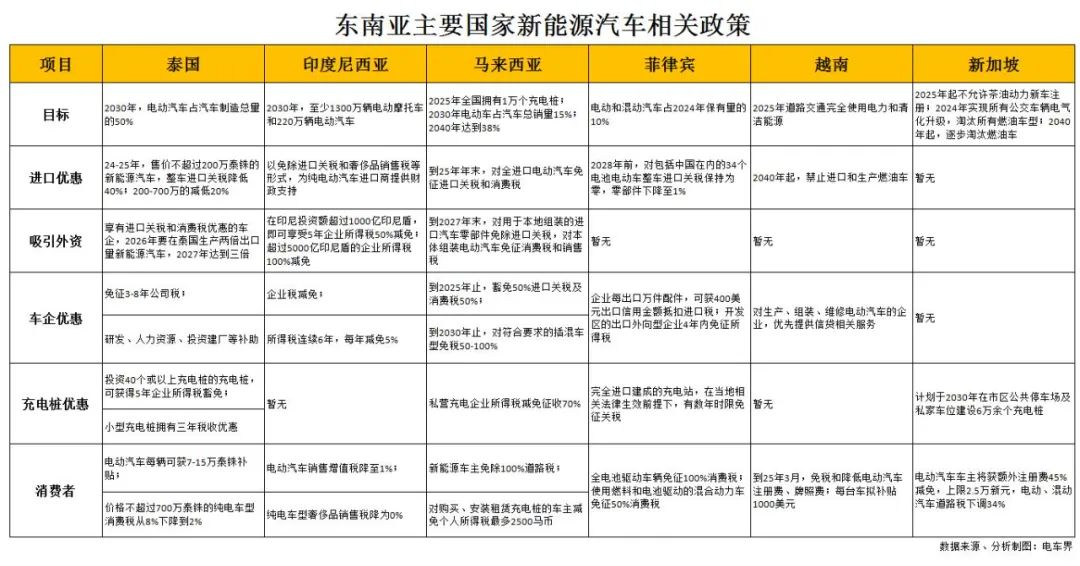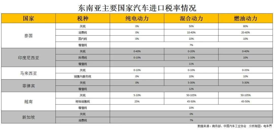 如泰国,作为东南亚汽车产业中心,对纯电动力汽车进口关税为零,从进口到销售,累计税率相较燃油动力汽车要低110-130%。