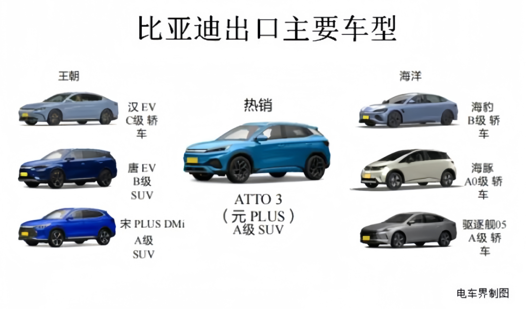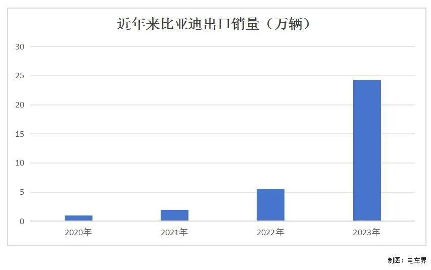 比亚迪2023年出口24.2万辆,同比增速超300%。进入日本、德国、澳大利亚、巴西、泰国等50多个国家和地区。数字化转型网www.szhzxw.cn