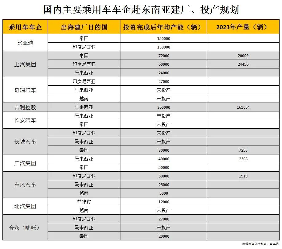 目前,国内主要乘用车车企,几乎都在东南亚有建厂的规划,部分工厂已经开始生产,还有不少工厂预计在今、明年建设完成,开始投产。
