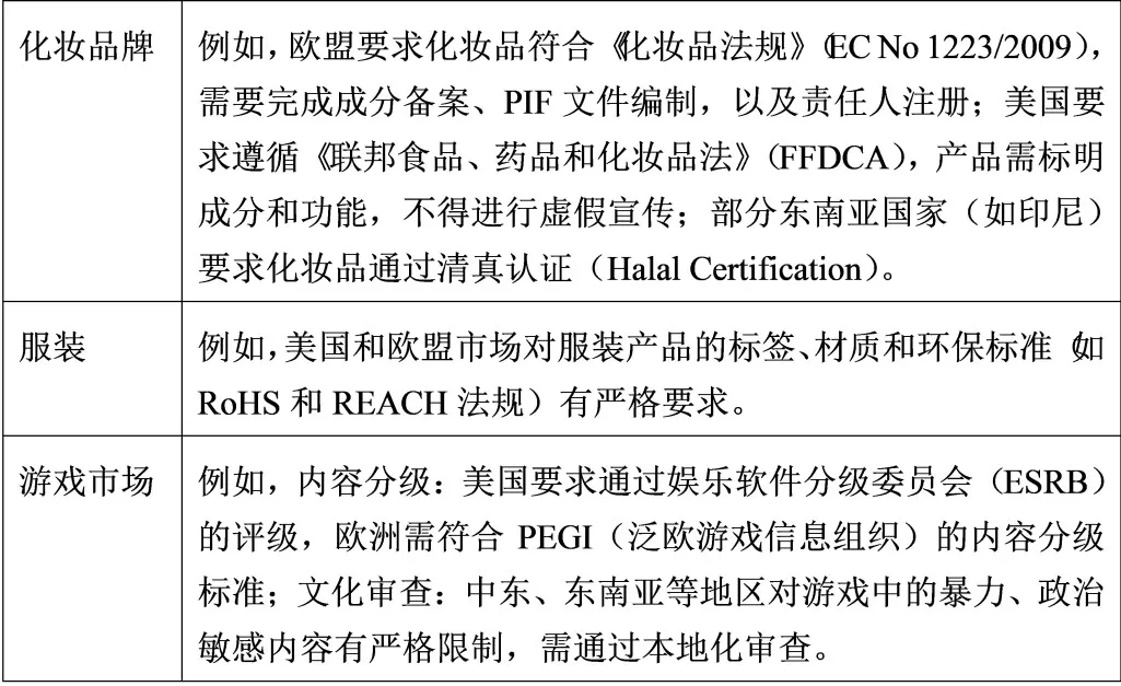 中国消费品近年来通过创新和多元的运营策略,成功进入欧美、东南亚等地区,积累了大量用户。与部分消费行业相关的市场准入要点为如下: