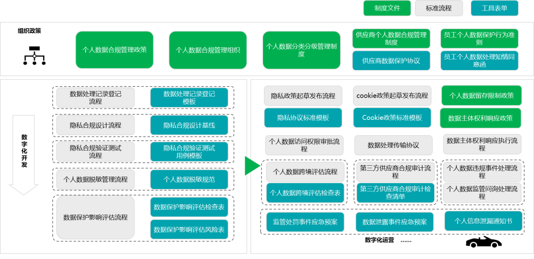 缺少制度流程的支撑,隐私设计便是无根之树。不论是隐私设计流程中的DPIA、RoPA、控制基线的管理,还是SCC、DPA等合规文档的制定,都需要一套规范的制度流程与明确的职责分工来指引、落地。与此同时,一些标准的隐私功能也需要相应的流程来支撑,如数据主体权利的响应、数据删除、数据修改等。因此,除了产品隐私设计流程本身,企业还需建立一整套隐私保护管理体系支持产品隐私设计的落地,如隐私数据的安全管控框架及配套规范指南、隐私数据的分级分类、数据保护影响评估、投诉机制及事件响应流程等。