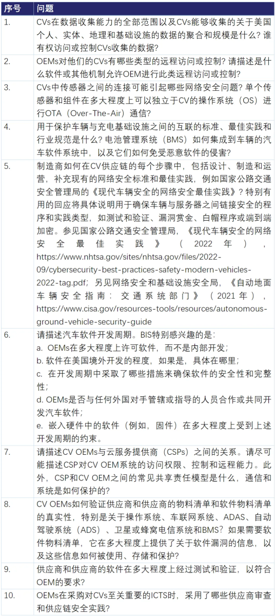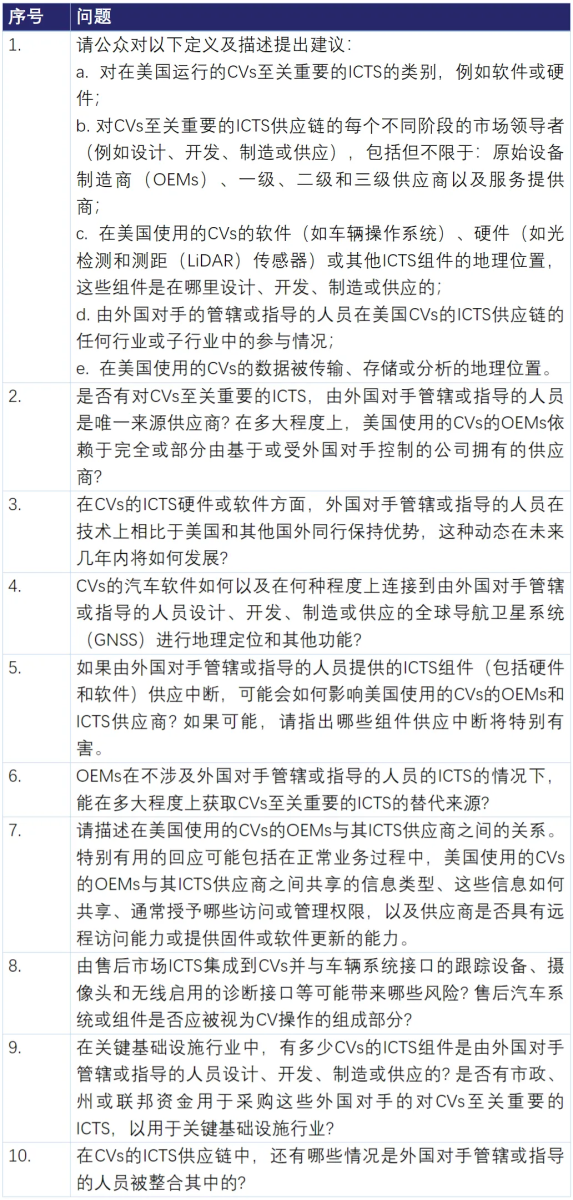 因此,ANPRM在这一部分广泛收集在美国的网联汽车中涉外国对手ICTS的使用情况及供应链状况,尤其是目前在美国的网联汽车中使用中国ICTS的具体情况: