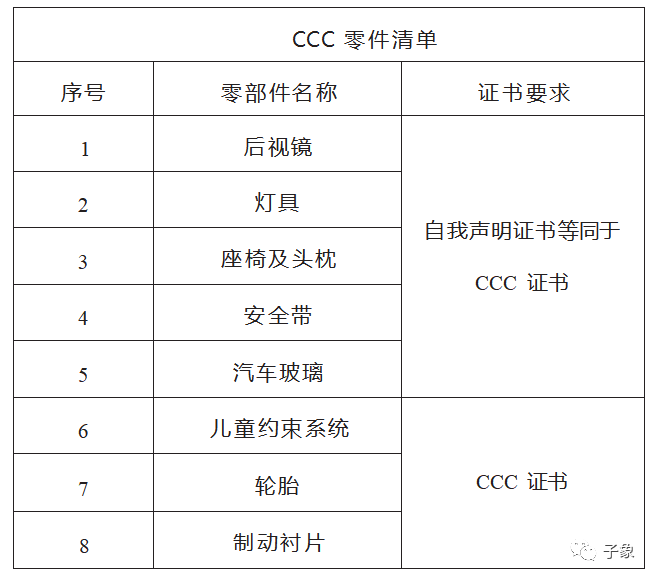 CCC(China Compulsory Certification)认证是国家认证认可监督管理委员会根据《强制性产品认证管理规定》制定的产品认证制度,自2002年5月1日起实施。目前汽车行业内要求取得CCC 证书或自我声明证书的零件如表所示。数字化转型网www.szhzxw.cn