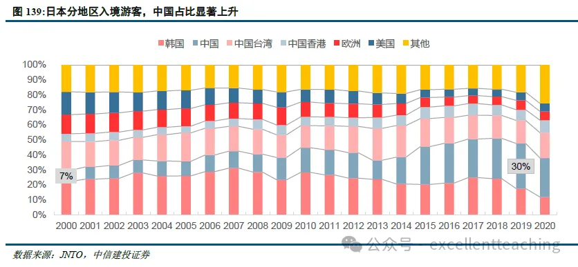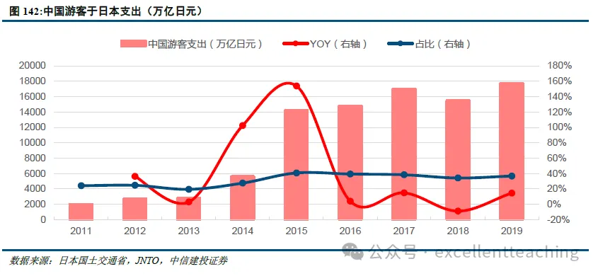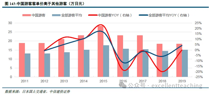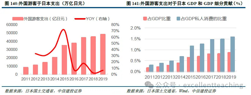 外国游客拉动日本国内消费,中国游客客单价高于平均水平。外国游客在日本的消费支出逐年提升,2011年游客消费支出占 GDP 比重为 0.16%,占 GDP 私人消费比重为 0.29%,2015 年日本外国游客支出同比增长71%,创下 10 年以来最高增速,此后外国游客支出对于日本经济和消费贡献占比稳步提升。其中,中国游客支出高于其他平均游客,中国游客支出在外国游客支出占比中最高。