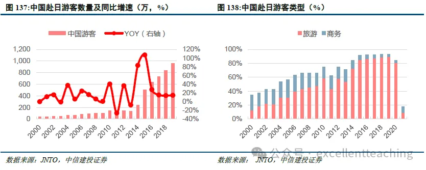 以旅游为例,中国赴日游客数量快速增长。金融危机冲击之后,安倍晋三上台实行宽松的货币政策,如上所述,日元汇率贬值带动入境游客大幅增长,2013 年突破 1000 万人次大关,此后增速幅度提升。2015 年是一个重要时间点,该年度入境游客增速达到 2000 年以来最高,入境游客同比增长 47%从而数量接近 2000 万。中国赴日游客数量大幅增长,尤其是 2015 年人民币兑日元升值,赴日游客数量大幅增长 107%达到 499 万。 数字化转型网www.szhzxw.cn