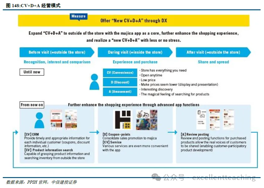 唐吉诃德的经营模式源于尾货销售,通过 CV+D+A 模式来保证购物体验。CV+D+A 的经验理念是为消费者提供便利(CV)、具备性价比(D)和有趣的购物体验。具体举措包括:注重产品质量,保证低价产品的高质量;部分门店 7×24 小时营业,新冠疫情之前 50%左右的营业 额都来源于晚八点后;购物时添加非日常性乐趣体验,如吉祥物、探索性购物安排;日常性的折扣保证用户的折扣体验等。