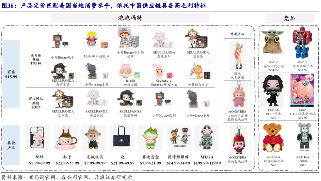 自有IP衍生叠加本土化,产品具备高毛利和独特性。从产品来看,盘点美国亚马逊和官方网站的热销盲盒IP,我们可以看到主要为小野Hirono、SKULLPANDA、Molly、Dimoo这四大中国核心IP,以及Crybaby、Peach Riot等海外艺术家IP,哈利波特、加菲猫等合作IP也同样受到美国当地欢迎。一方面,自有IP具备高毛利和独特性,且公司对于IP的衍生开发与运营有较强的把控力和稳定性;另一方面,与头部第三方的IP合作将有效提升知名度打开市场,本土化IP更易获得当地消费者文化认同。从定价来看,产品定价匹配美国当地消费水平,依托中国供应链具备高毛利特征。泡泡玛特核心盲盒定价在15.99美元,FUNKO和MGA的手办价格在12-30美元左右;而MEGA、毛绒玩具等产品则定价在40-1000美元区间,和环球影城、Brick Bear的定价相近,其产品定价匹配美国当地消费水平,较国内溢价率为70%,依托中国供应链,泡泡玛特毛利率优势显著。数字化转型网www.szhzxw.cn