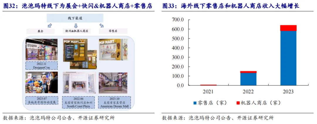 DTC全渠道多样化模式布局,快速把握美国市场。线下为“展会露出+快闪&机器人商店试点+零售店落地”的模式,2023年海外线下渠道收入同比增长325%,零售店和机器人商店均大幅扩张,2023年内分别新增42/50家门店,收入分别同比增长330%/277%;线上采用“跨境电商+官方APP+国际官网”组合的模式快速触达终端,2023年海外线上渠道收入同比增长73%,泡泡玛特通过多样化的直营渠道进行拓展,在把握终端消费者喜好的同时,展会能够快速提升品牌认知度以打开美国市场,机器人商店和线上渠道的补充有效的弥补了前期零售店试错和资本开支的问题,快速覆盖市场;而海外零售店的单店店效高于国内,有望持续贡献收入带来新业绩增长点。