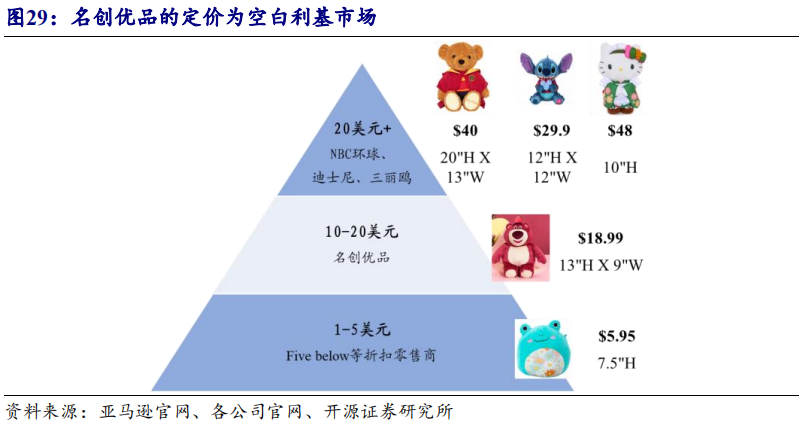 另一方面,名创优品丰富的IP联名使得产品具备差异化和高毛利。目前美国IP产品占比达70%,定价主要在10美元左右。从产品来看,相较于Five Below与星球大战、迪士尼、漫威、Squishmallows等大公司合作,以销售合作方热门IP的授权产品,名创优品选择与全球多个热门IP版权方合作,共同开发差异化产品并打造IP消费场景,具备线下零售的独特性。从定价来看,名创优品的定价为空白利基市场,折扣零售商的产品售价主要集中在1-5美元区间,而IP版权方衍生品销售价格较高,以10英寸左右的玩偶为例,普遍定价在20-50美元之间,名创优品的IP联名产品同时满足消费者的性价比需求和情感消费需求,也使得产品具备差异化和议价能力,带动盈利能力提升。数字化转型网www.szhzxw.cn