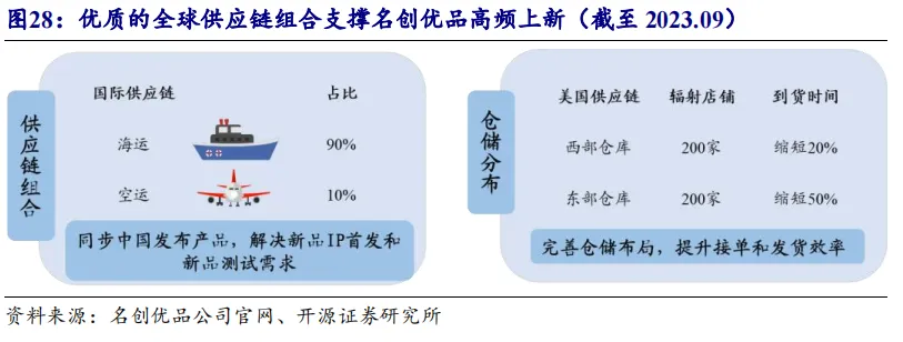 我们认为名创优品的优势一方面来自于公司优质的全球供应链以及数字化系统,可以支撑高频上新和足够的毛利空间。美国本土软折扣龙头大多以第三方外采产品为主,对产品开发的把控能力有限,名创优品则基于数字化系统把握消费者偏好变化,并通过全球供应链快速匹配消费者核心诉求,实现快速上新。同时,针对美国海运周期较长的问题,公司采用空运的形式同步中国发布产品,目前空运占比10%,能够解决新品IP首发和新品测试需求。名创优品持续完善仓储布局,提升接单和发货效率,2023年新增东部仓库,东部、西部仓库货品到店时间分别缩短50%、20%。此外,上文所述的美国本土龙头毛利率在25%-35%之间,而名创优品基于优质供应链开发自有品牌,商品毛利率达60%,具备足够的毛利空间。