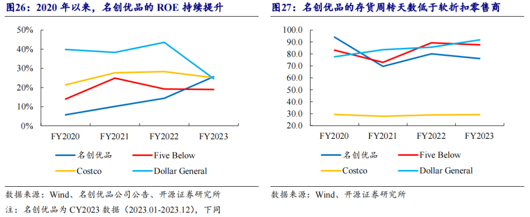 名创优品的ROE高于美国本土龙头,主要来自高盈利和较高周转。随着IP战略持续推进以及美国直营市场开拓,名创优品的ROE从2020年的6%提升至2023年的26%,超过Five Below、Costco、Dollar General等零售商。OPM从2020年的1%逐步提升至2023年的20%,其中2023年下半年美国业务OPM约为中双位数,明显优于美国本土龙头;而存货周转天数也低于软折扣零售商,2023年名创优品的存货周转天数为76天,相较于Five Below、Dollar General分别少11、16天。数字化转型网www.szhzxw.cn