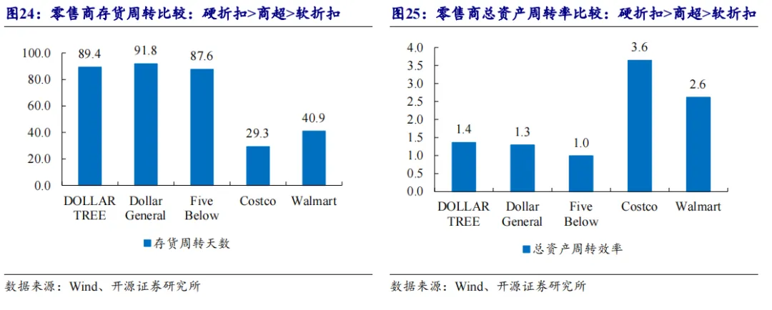 硬折扣高周转、软折扣高盈利,支撑高ROE水平。我们对比软折扣、硬折扣、传统商超零售商龙头的最新年度财务数据可以发现,不同类型的优质龙头ROE均处于15%-25%的较高水平,其中Dollar Tree、Dollar General等软折扣零售商的毛利率在25%-35%之间,经营利润率在5%-15%之间,高ROE主要来自优秀的选品带来较高盈利能力;而Costco、Sam’s Club等仓储会员零售商的毛利率在10%-15%之间,经营利润率在2%-4%之间,在低毛利的情况下,高ROE主要来自较低费用率、高周转,Costco的存货周转天数为30天左右,总资产周转效率为3以上,而Dollar Tree、Dollar General等软折扣龙头存货周转天数为90天左右, 总资产周转效率在1-1.5之间。