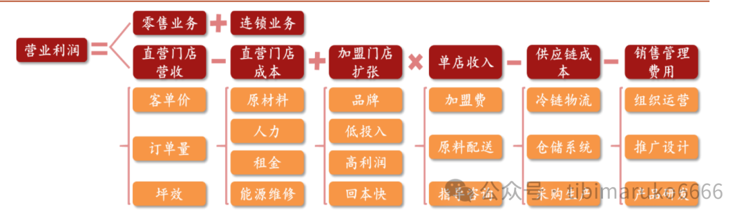 ①蜜雪冰城:致力于打造集产品研发、生产、仓储物流、销售、连锁经营为一体的完整产业链。产业结构如下: