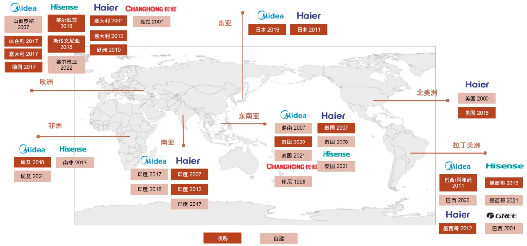 在海外产能积极布局和品牌并购整合下,中国大家电企业全球竞争力逐步显现。中国大家电企业从2010年代起,就开始探索海外市场,并以自建生产基地和兼并收购的形式实现扩张。美的、海尔为代表的大家电企业一方面受大家电运输半径影响,在全球范围自建工厂,另一方面通过收购完善海外布局。目前大家电企业已在欧洲、美洲、东南亚、南亚、东亚、非洲等地区完成大规模的生产基地建设,区域辐射效应明显。