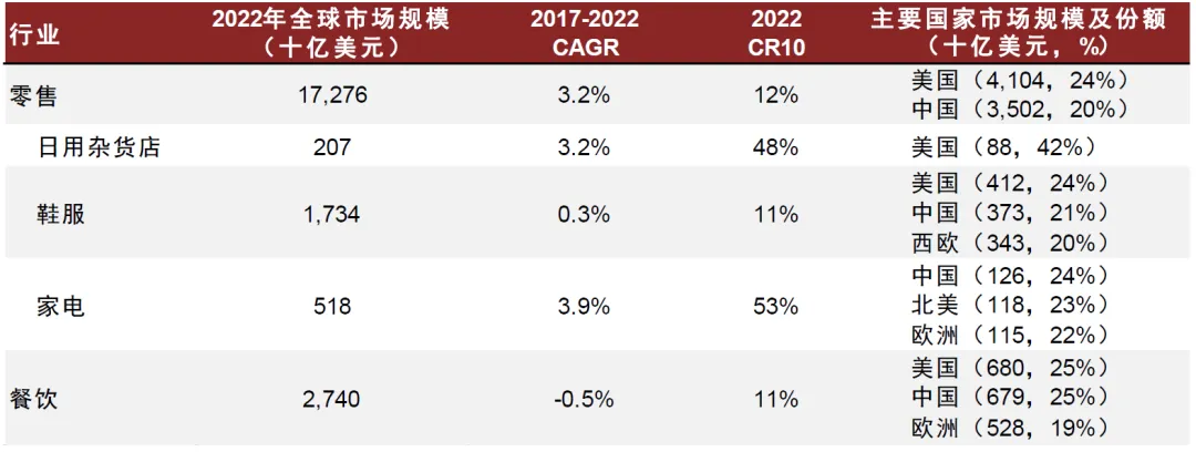 全球消费市场规模较大且仍有稳定的增速。据Euromonitor,2022年全球零售市场规模约17万亿美元,2017—2022 CAGR为3.2%。从主要的中国消费企业出海领域来看,各领域的全球市场空间较大,据Euromonitor,日用杂货、鞋服、家电和餐饮行业在2022年的全球市场规模分别达2,075、17,342、5,183和27,400亿美元。从具体的地区市场结构看,欧美地区在多个行业均占据了全球市场接近一半的份额。据Euromonitor数据,在日用杂货行业,美国市场占据了全球42%的份额;在鞋服行业,美国和西欧市场占据了全球44%的份额;在家电行业,欧洲和北美市场占据了全球45%的份额;在餐饮行业,美国和欧洲市场占据了44%的份额。欧美地区广阔的消费市场空间为中国消费品企业出海提供了较大的机会。